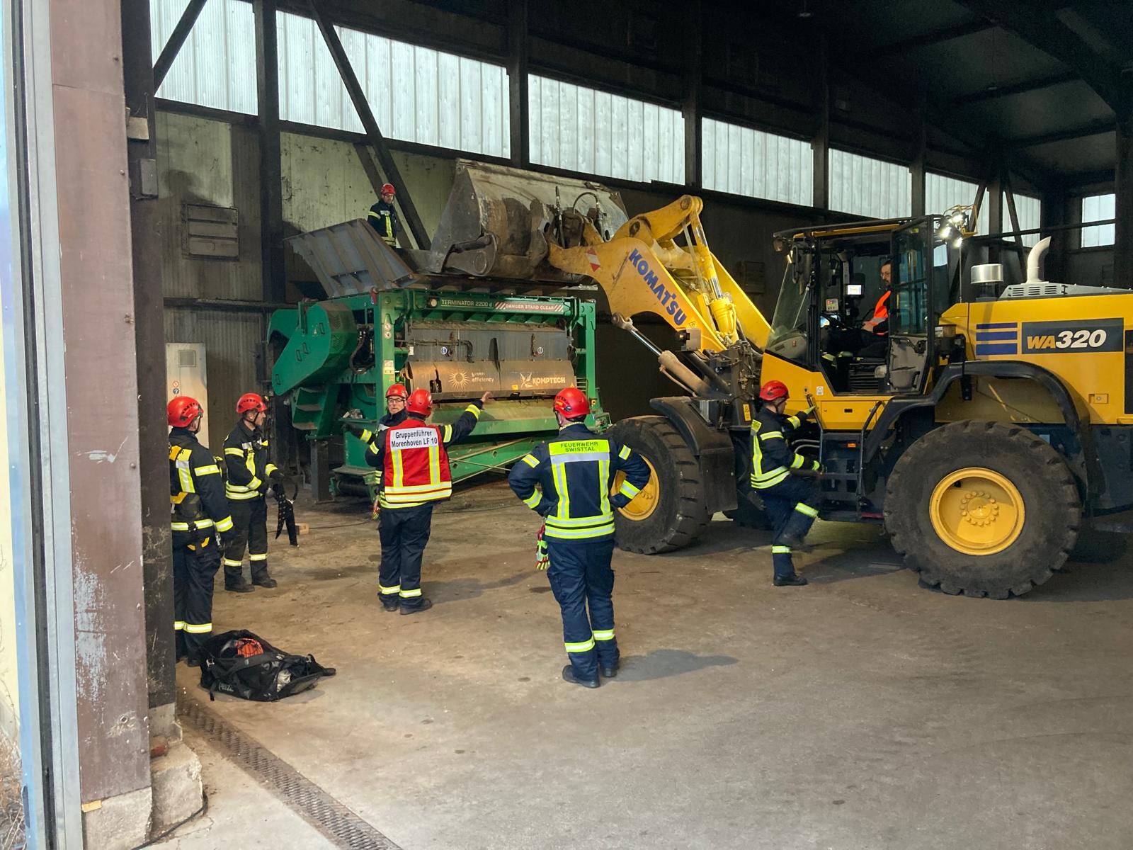 Der "Unglücksrabe" brach sich erst den Fuß, als er oben in einem knapp 4 Meter hohen Schredder umknickte und gerettet werden musste. Hier erleichterte ein Radlader der Firma den Kameraden die Arbeit.