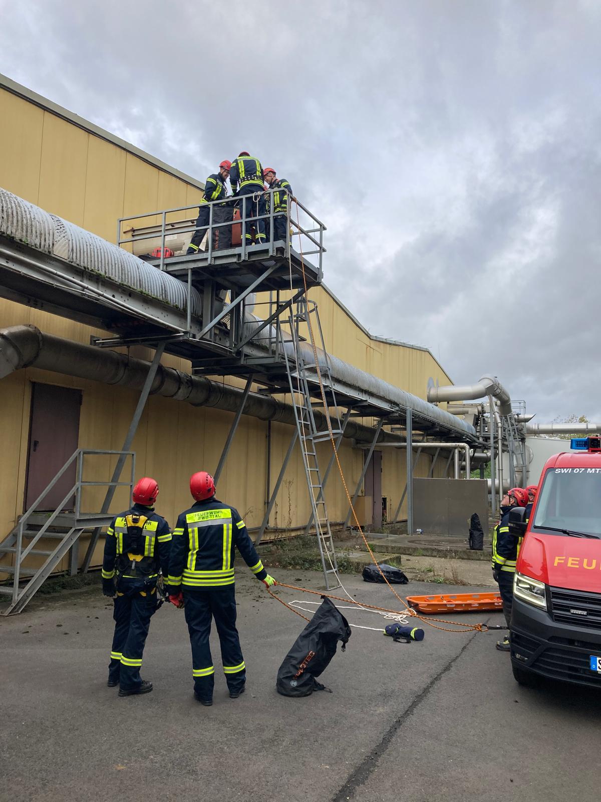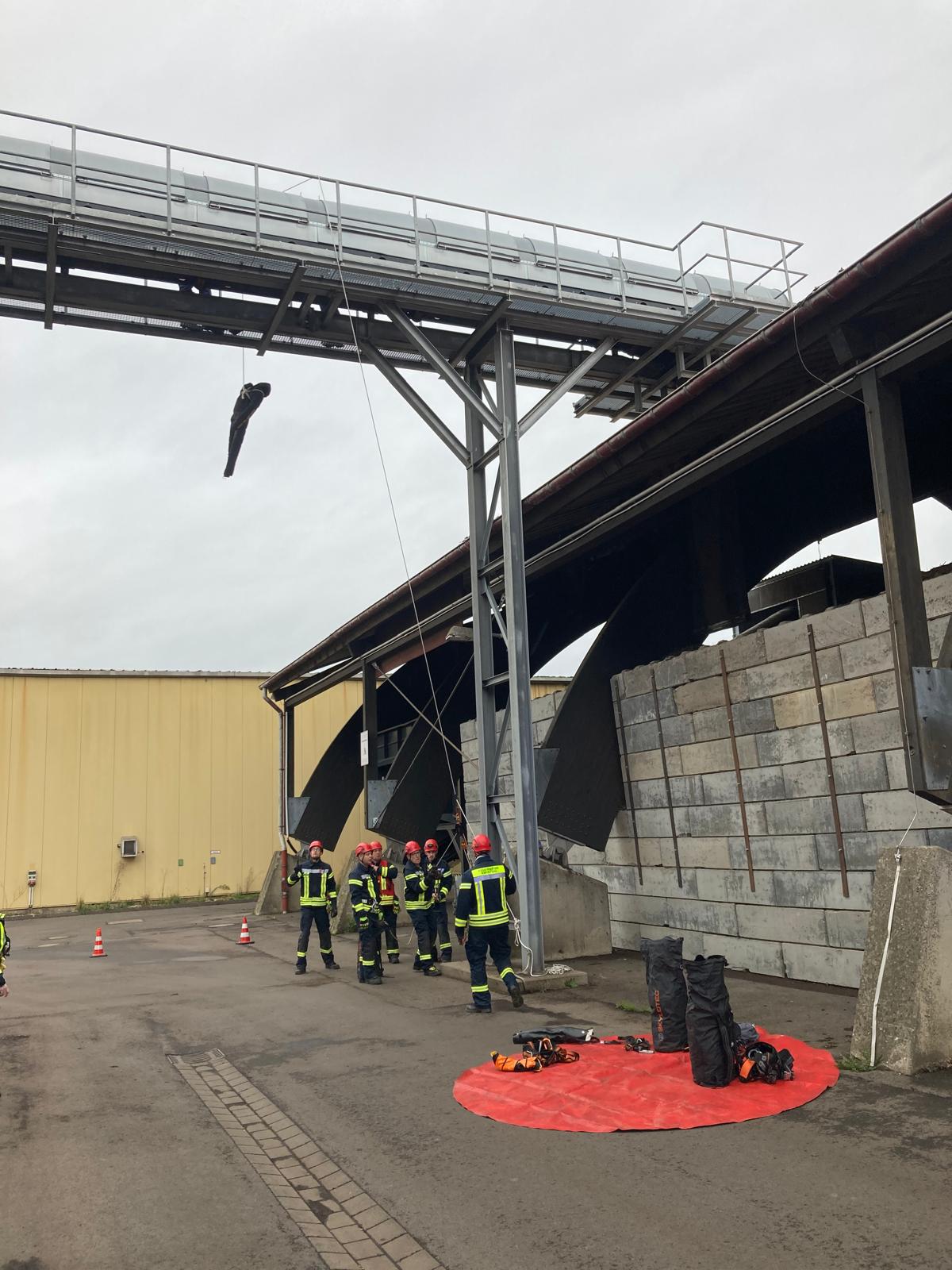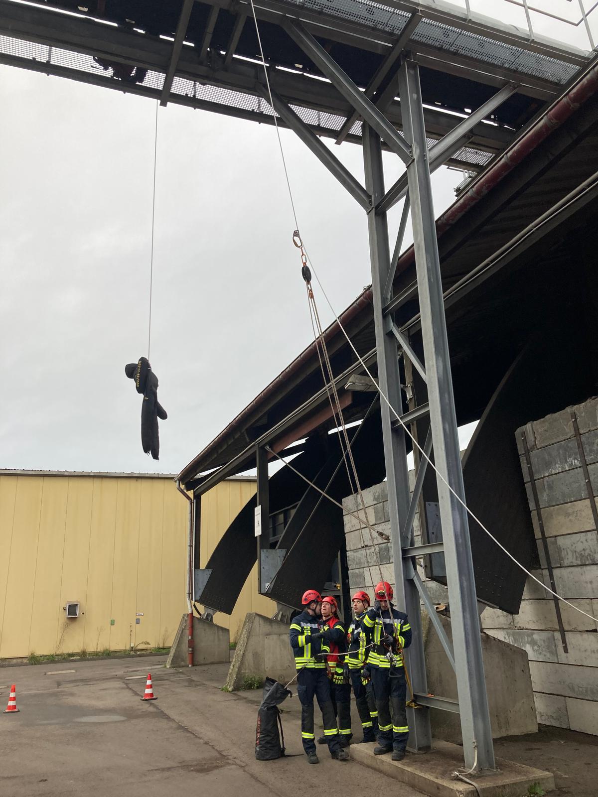 An diesem Samstag hatte unsere Einheit für Absturzsicherung und einfache Rettung aus Höhen und Tiefen (ERHT) wieder einen ihrer regelmäßigen Übungstage. Innerhalb von 5 Stunden wurde ein unglücklicher Mitarbeiter (natürlich handelte es sich dabei nur um einen Übungsdummy) der Firma RSAG mehrfach gerettet.