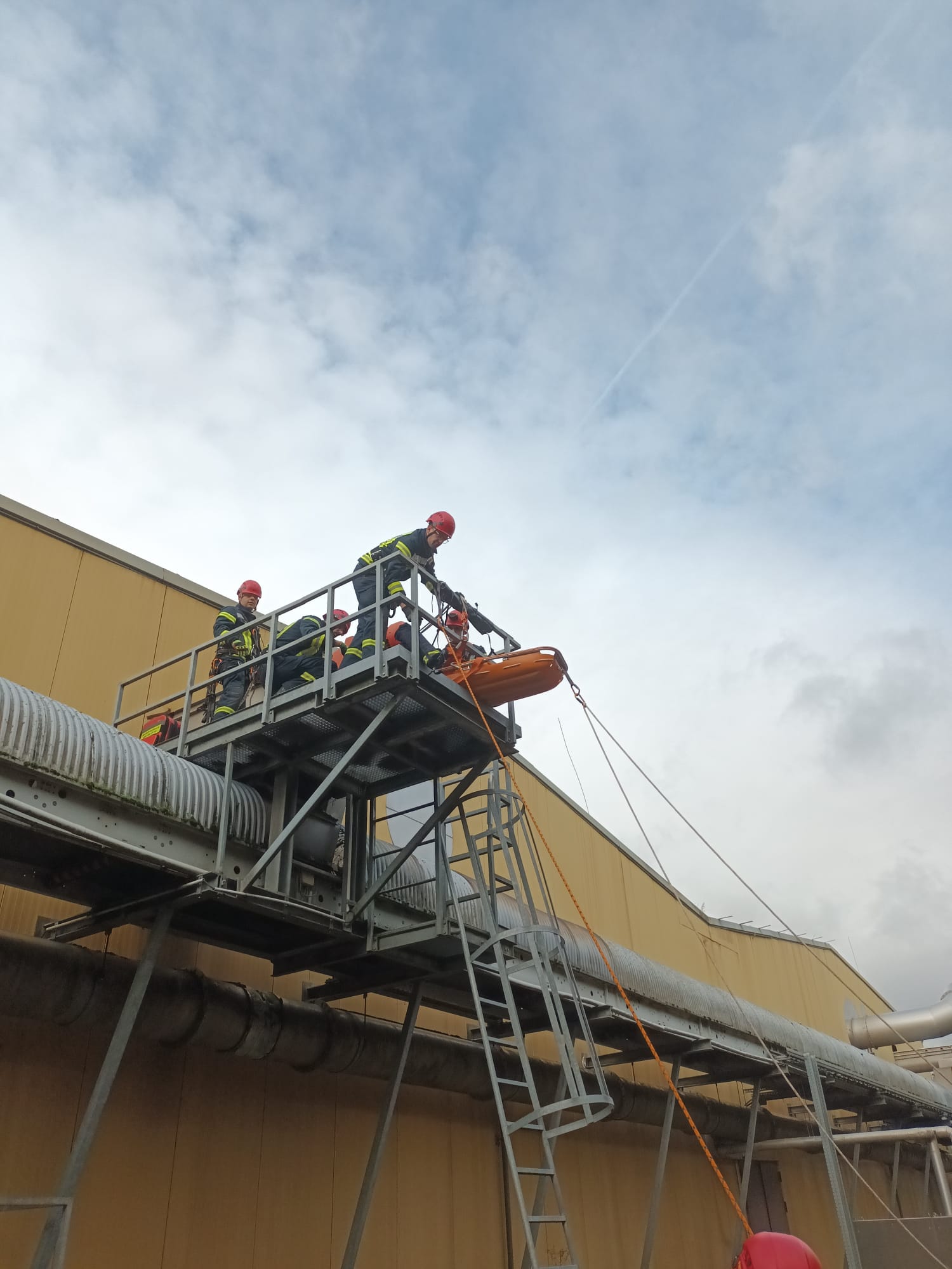 Leider war es nicht der letzte Notfall des Tages: Kaum am Boden wollte der pflichtbewusste Mitarbeiter eine Förderschnecke in 5m Höhe reparieren. Wahrscheinlich durch die Strapazen des Tages erlitt er nun einen Schwächeanfall und wurde dort oben ohnmächtig. Also rückte die Einheit erneut zu seiner Rettung an. Nachdem er nun mit einer Trage per Flaschenzug wieder auf den Boden gebracht wurde, beschloss er sich den restlichen Tag frei zu nehmen.